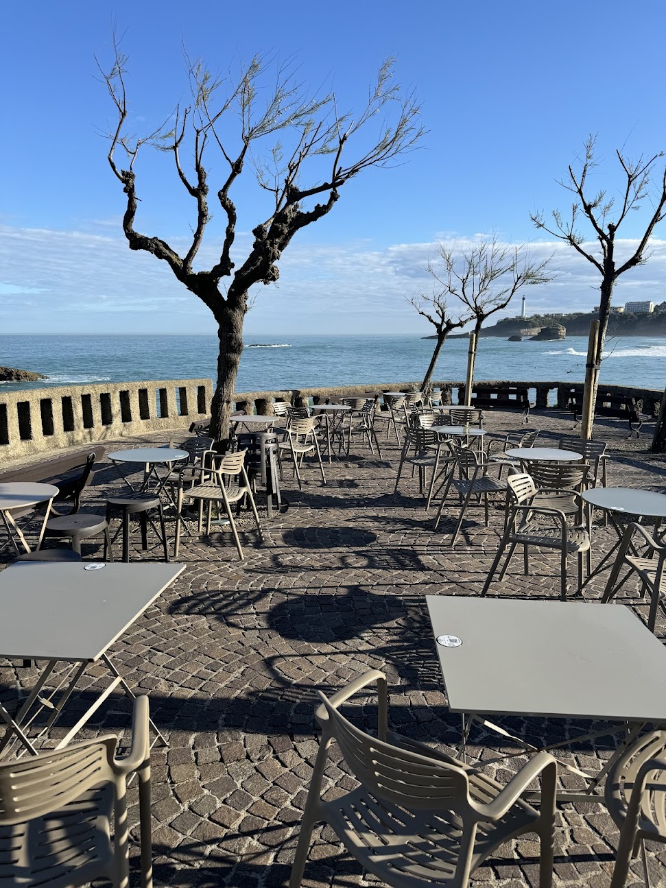 Galettes salées et crêpes/gaufres sucrées dans un café animé doté d'une terrasse avec vue sur l'océan.